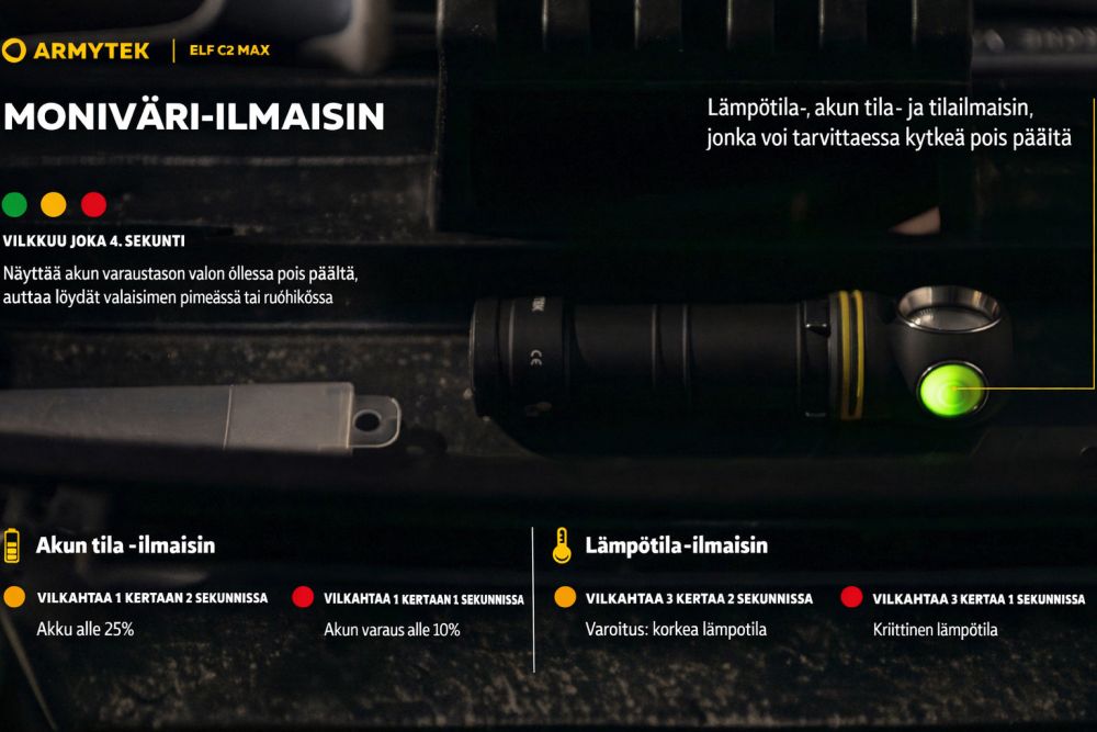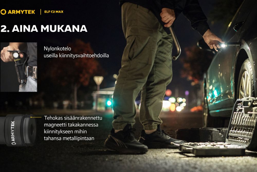 Armytek Elf C2 Max toimii otsalamppuna, taskulamppuna, urheiluvalaisimena sekä työvalona. Otsapanta on mukava ja tukeva, ja valaisin kiinnittyy siihen nopeasti sekä kääntyy 180°.Kompakti rakenne, kätevä sivupainike, teräsklipsi, nylonkotelo ja voimakas magneetti mahdollistavat monipuoliset kiinnitystavat. Valaisin voidaan käyttää myös suoraan USB-virtalähteestä tai Powerbankista ilman akkua.