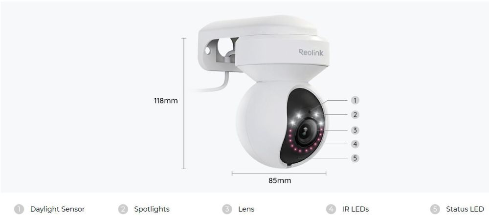 Reolink E1 Outdoor on monipuolinen 5MP tarkkuudella varustettu WiFi-kamera sisä- ja ulkokäyttöön (IP64).Videokuvaa, älykästä liiketunnistusta ja asetuksia voi hallita reaaliaikaisesti Reolink App-sovelluksella (Android ja iOS) ja Reolink Client-ohjelmalla (Windows ja macOS). Asetuksista voi mm. säätää liiketunnistuksen herkkyyttä, määritellä sähköpostiosoitteen johon videokuvia automaattisesti lähetetään kameran havaittua liikettä, muokata laajempiakin hälytystoimintoja, verkkoasetuksia, äänen tallentamista ja paljon muuta.
