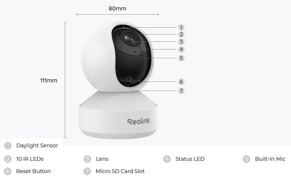 Sisäänrakennettu mikrofoni ja kaiutin mahdollistavat kaksisuuntaisen äänen. Infrapuna-LEDien (10kpl) ansiosta kamera näkee myös pilkkopimeässä, aina 12 metriin saakka. Kameran WiFi-yhteys toimii sekä 2.4 GHz että 5 GHz taajuuksilla. Virta-adapterin kaapeli on 3 metriä pitkä.