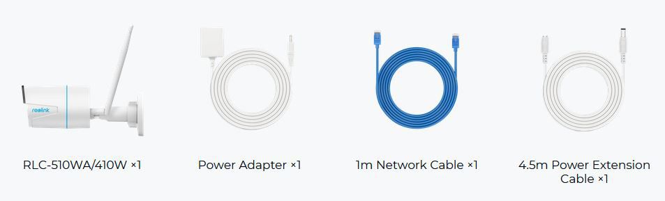 Reolink W320 (RLC-511WA) kamera, verkkovirta-adapteri, 1m Ethernet verkkokaapeli, 4.5m jatkovirtajohto, pikaopas (englanniksi), varoituskyltti, ruuvaussapluuna, ruuvit ja tulpat, ruuvaustyökaluKatso myös: